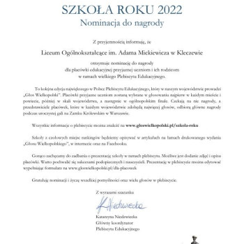 Nasza szkoła została zgłoszona przez uczniów i ich rodziców do nagrody Szkoła Roku w wielkim Plebiscycie Edukacyjnym, który w województwie wielkopolskim jest prowadzony przez „Głos Wielkopolski”. Ponadto nominację do tytułu Nauczyciel Roku otrzymała pani Paulina Radecka-Struglińska.Głosowanie w plebiscycie rozpocznie się już we wtorek, 25 października. Wszystkie informacje o akcji można znaleźć w naszym serwisie internetowym pod adresem: www.gloswielkopolski.pl