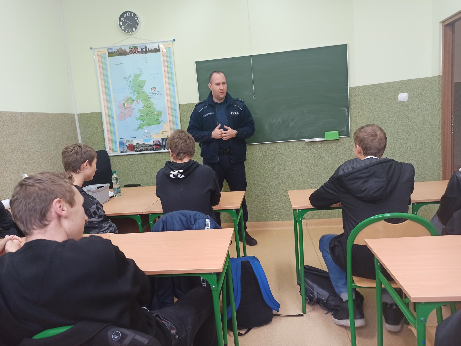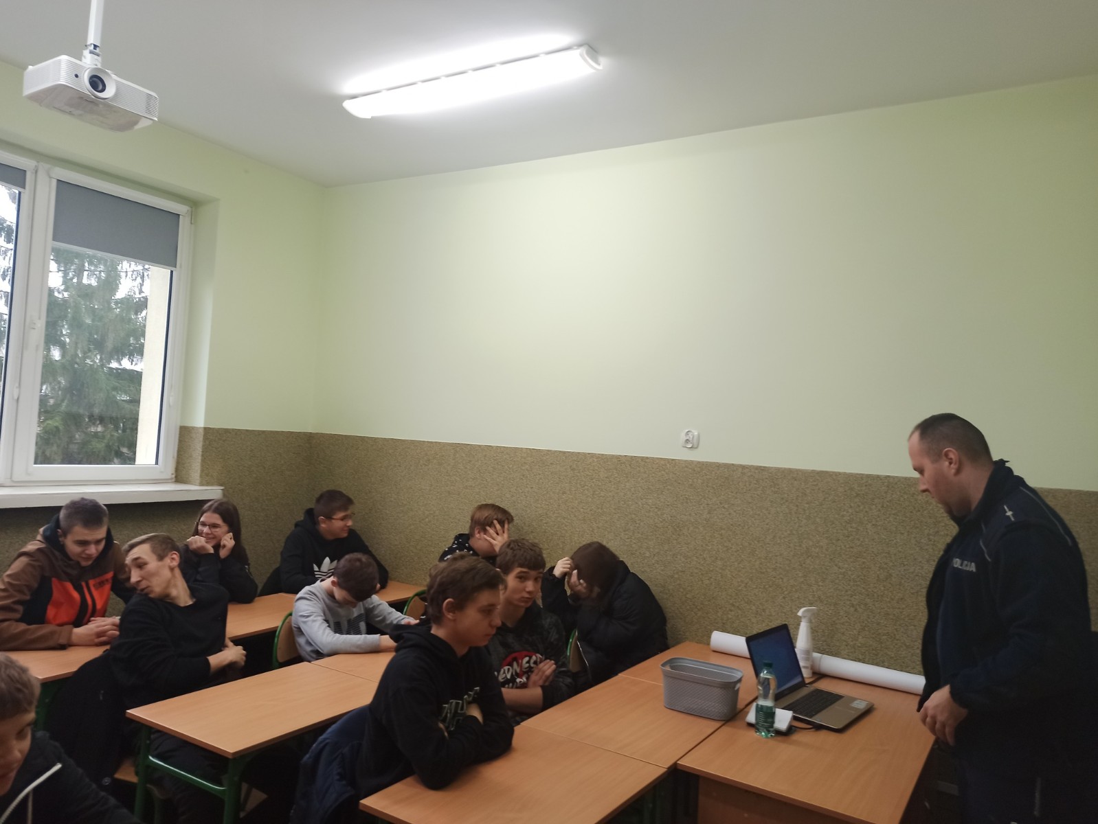 W miniony poniedziałek 7.11.2022r. odbyło się spotkanie uczniów klas pierwszych z dzielnicowym młodszym aspirantem p. Bartoszem Narożnym. Celem spotkania było uświadomienie młodzieży zagrożeń pojawiających się we współczesnym świecie oraz odpowiedzialności prawnej. Uczniowie mieli możliwość zadawania pytań na interesujące ich tematy.