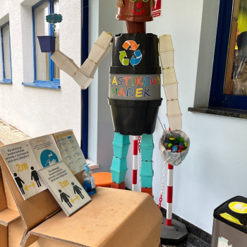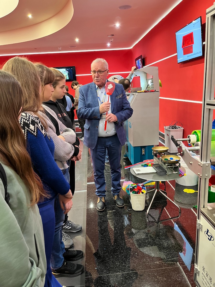 Kolejnym ważnym elementem wyjazdu było uczestnictwo w warsztacie prowadzonym w Punkcie Edukacji Ekologicznej, gdzie uczniowie poznali zasady recyklingu, proces przetwarzania surowców w firmie i jak działa nowoczesna maszyna Eremado recyklingu tworzyw sztucznych. Przetwórstwo tworzyw sztucznych pana Marka Margielewskiego jest idealnym przykładem odpowiedzialnego biznesu, który działa z poszanowaniem zasad zrównoważonego rozwoju i kładzie duży nacisk na edukację. W czasie zwiedzania hali produkcyjnej młodzież zobaczyła jak z granulatu powstaje nowy produkt, każdy z uczestników otrzymał pakiet wytworzonych z surowców wtórnych doniczek. Rozmowa z właścicielem firmy oraz naukowcami z Politechniki Bydgoskiej uświadomiła uczniom, że to nie tworzywa sztuczne są problemem ale to jak nimi gospodaruje człowiek.