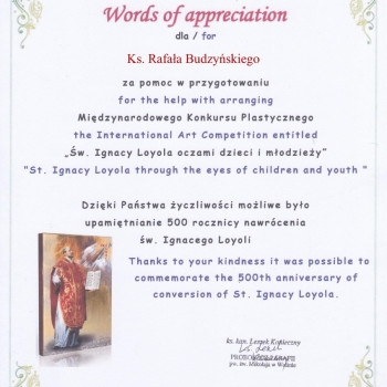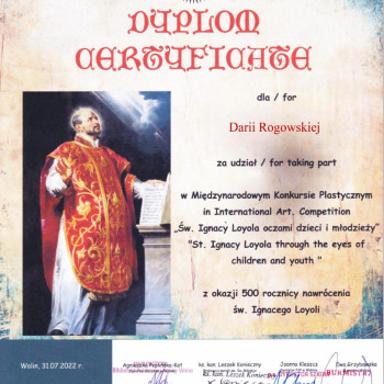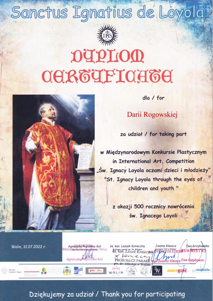 Z okazji 500 rocznicy nawrócenia św. Ignacego Loyoli odbył się Międzynarodowy Konkurs Plastyczny zorganizowany przez   Publiczną Szkołę Podstawową im. Bolesława Krzywoustego w Wolinie. Na konkurs wpłynęły 384 prace z ponad 100 szkół, przedszkoli i placówek kulturalno-oświatowych z Polski, Boliwii, Chorwacji, Czech, Etiopii, Filipin, Francji, Indii, Irlandii, Kazachstanu, Kirgistanu, Litwy, Mjamny, Niemiec, Norwegii, Rwandy, Ukrainy, Węgier i Włoch. W konkursie udział wzięła uczennica naszej szkoły Daria Rogowska z klasy IIIA.