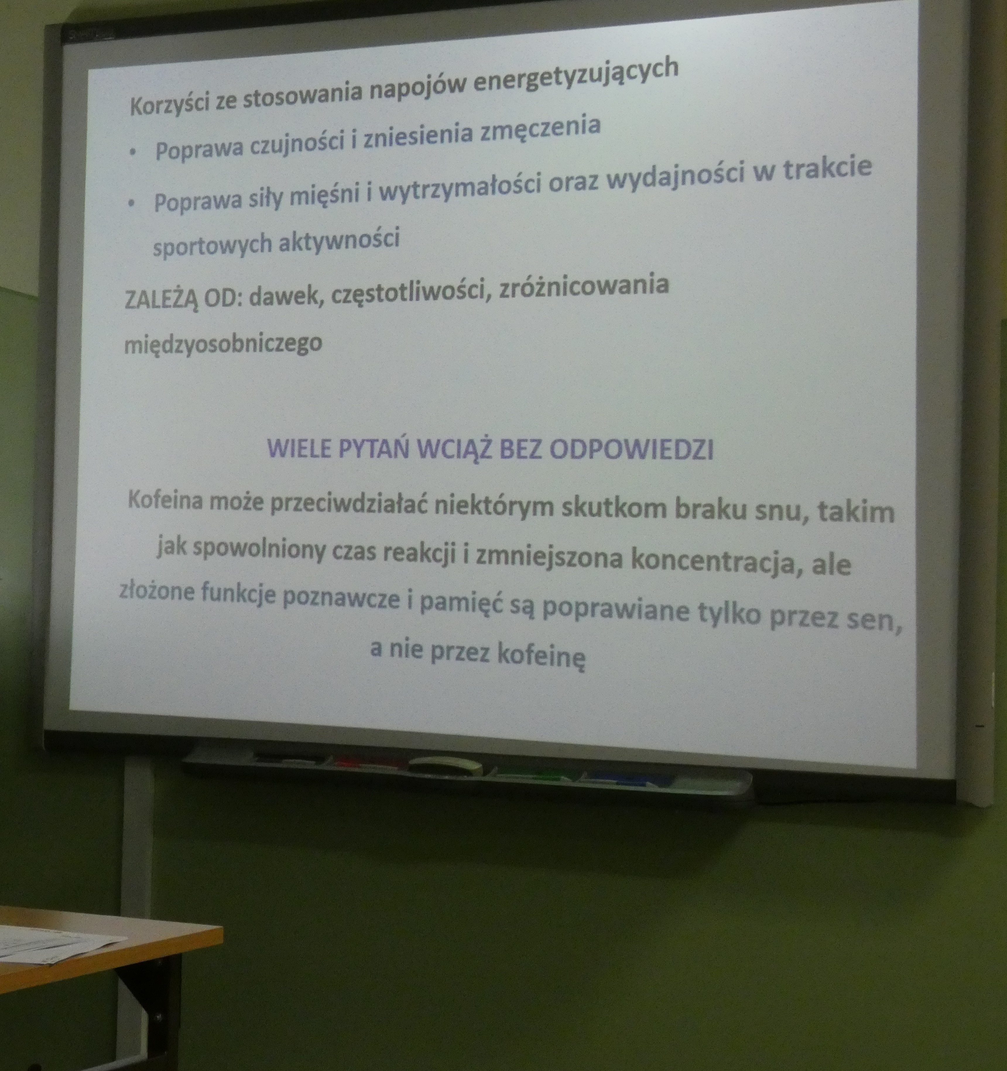 We wtorek 12.04.2022 r. na lekcji biologii w klasie III AP przeprowadziła kolejny wykład p. Agnieszka Saran-Jagodzińska dr n. farm. adiunkt na kierunku dietetyka Akademii Nauk Stosowanych w Koninie. Wykład dotyczył wpływu napojów energetyzujących na zdrowie człowieka. Uczniowie usłyszeli wiele cennych informacji o ich składzie oraz działaniu na organizm. Był to kolejny wykład z cyklu dotyczącego odżywianiu człowieka. Wykłady na temat dietoprofilaktyki nowotworów oraz chorób układu krążenia odbyły się również 4 i 11 kwietnia na lekcjach wychowawczych klasy III BGi w formie zdalnej. Organizacją tego cyklu były nauczycielki biologii Agnieszka Kowalik i Maria Michnik.